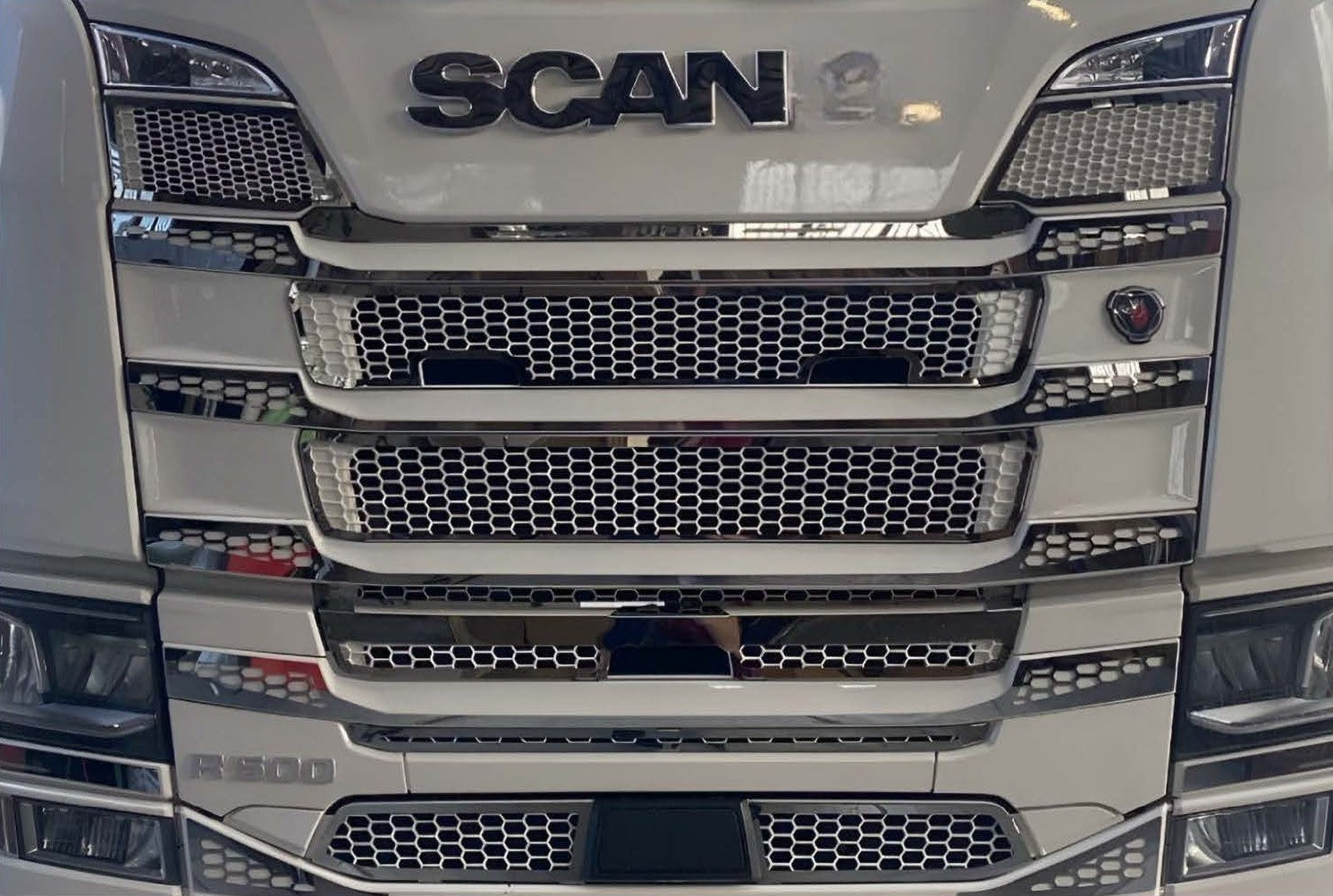 Il design forato aggiunge profondità e dinamismo alla maschera, valorizzando la linea aggressiva e distintiva della Scania Serie S.