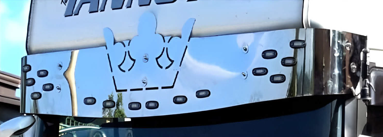 Dai un tocco esclusivo al tuo Scania con la visiera inox con corona, realizzata con spessore 2 mm e fori predisposti per LED. Realizzata in acciaio inox lucido a specchio, unisce eleganza, robustezza e funzionalità, valorizzando il frontale del camion con stile e personalità.
